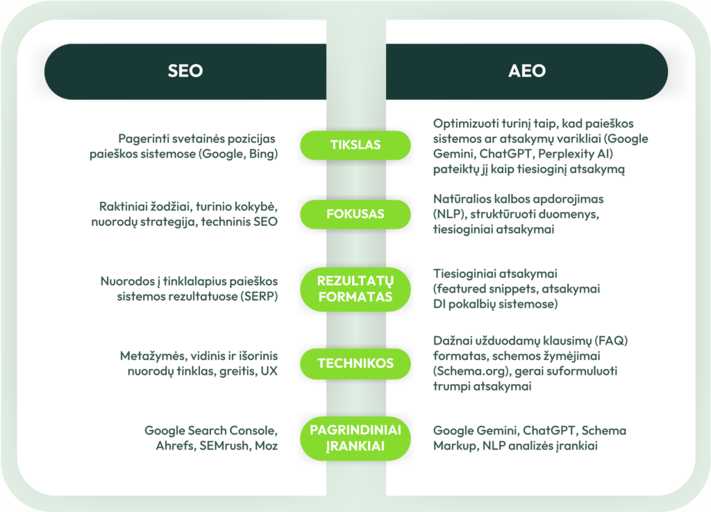 SEO helps websites rank higher in search results, while AEO ensures that content is discovered and utilized by Answer Engines. The main differences between these two optimization methods are illustrated below.